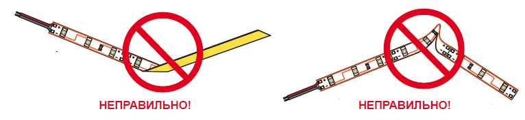 - при монтаже светодиодной ленты следует проявлять аккуратность. Нельзя применять сильные механические нагрузки, ставить на ленту инструмент или наступать на нее ногами. Необходимо избегать попадания посторонних предметов на светодиоды, а также их случайного контакта с твердыми предметами