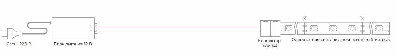Для начала необходимо подключить светодиодную ленту 5 м к блоку питания.