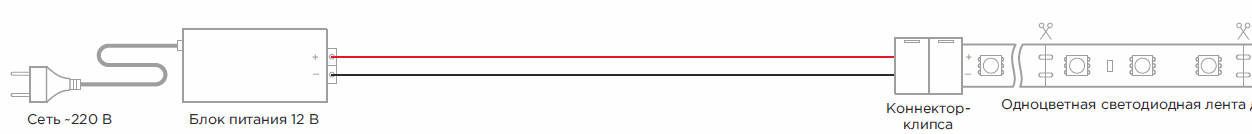 Подключение производится при выключенном напряжении электросети 220В с соблюдением полярности контактов подключения и сторон подключения (см. Подключение ленты к блоку питания).